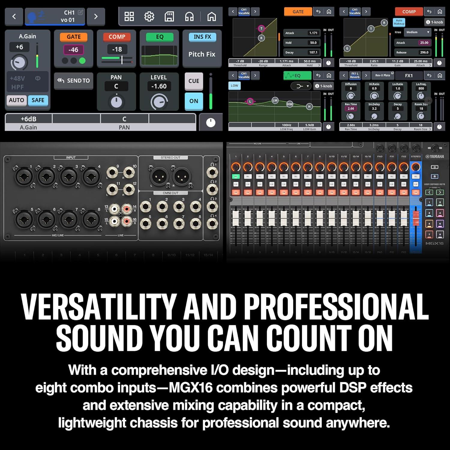 Versatile I/O (New MGX preamps with 86 dB gain range, Bluetooth audio input, microSD card slot) and powerful mixing capabilities.